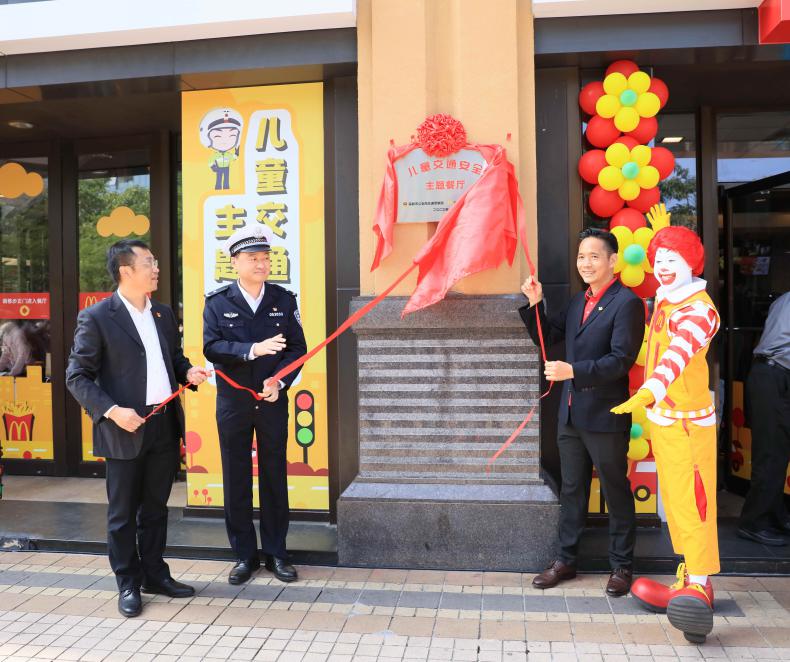 深圳市交警局、福田區(qū)香蜜湖街道辦、深圳麥當勞領(lǐng)導與麥當勞首席快樂官麥當勞叔叔共同為全國首家麥當勞兒童交通安全主題餐廳揭牌
