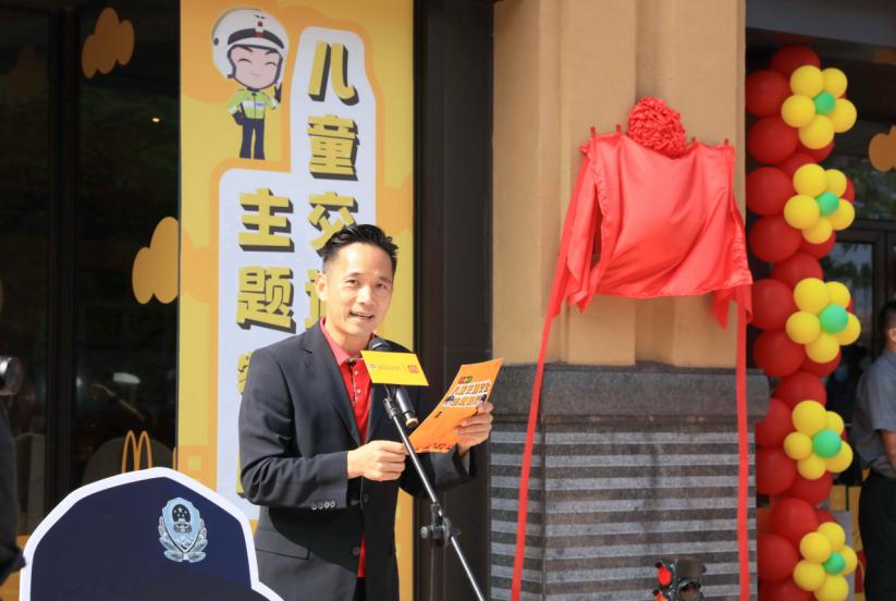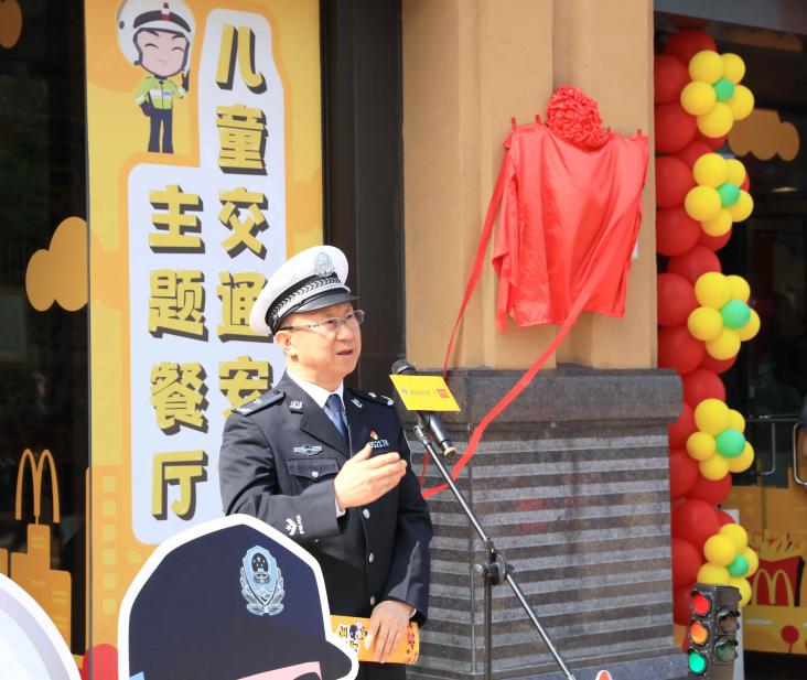 全國首家麥當勞兒童交通安全主題餐廳(深圳市福田區(qū)東海城市廣場餐廳)啟動儀式上,深圳市交警局副局長馮新毅致辭