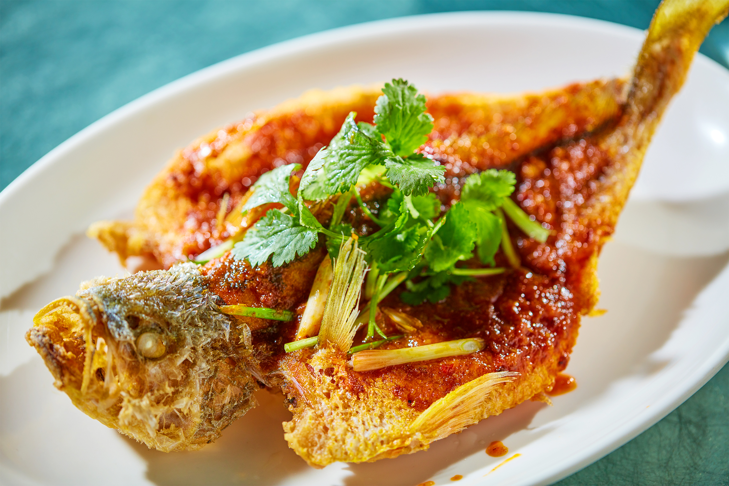 “叄巴醬淋黃花魚(yú)”是東南亞風(fēng)味的黃花魚(yú)烹調(diào)法,用新加坡的傳統(tǒng)配方,用多達(dá)十幾種香料手工炒制叄巴醬,調(diào)入了少許番茄汁、蝦醬和醬油,讓醬料甜辣酸咸皆備,賦予黃花魚(yú)獨(dú)特的風(fēng)味。砂鍋黃花魚(yú)湯,是用煎香的黃花魚(yú)經(jīng)猛火燉煮,燉出奶白色,才算好魚(yú)湯;黃花魚(yú)溜采用福建當(dāng)?shù)鬲?dú)有的熗溜做法,以純地瓜粉包裹,保持著魚(yú)肉的嫩滑口感,搭配鮮蔬更開(kāi)胃;咸魚(yú)炒芥藍(lán),這或許是從潮汕菜里節(jié)儉而來(lái)。黃花魚(yú)制作的咸魚(yú)丁成了芥藍(lán)的最佳新標(biāo)配,魚(yú)油讓芥藍(lán)煥發(fā)別樣鮮爽。