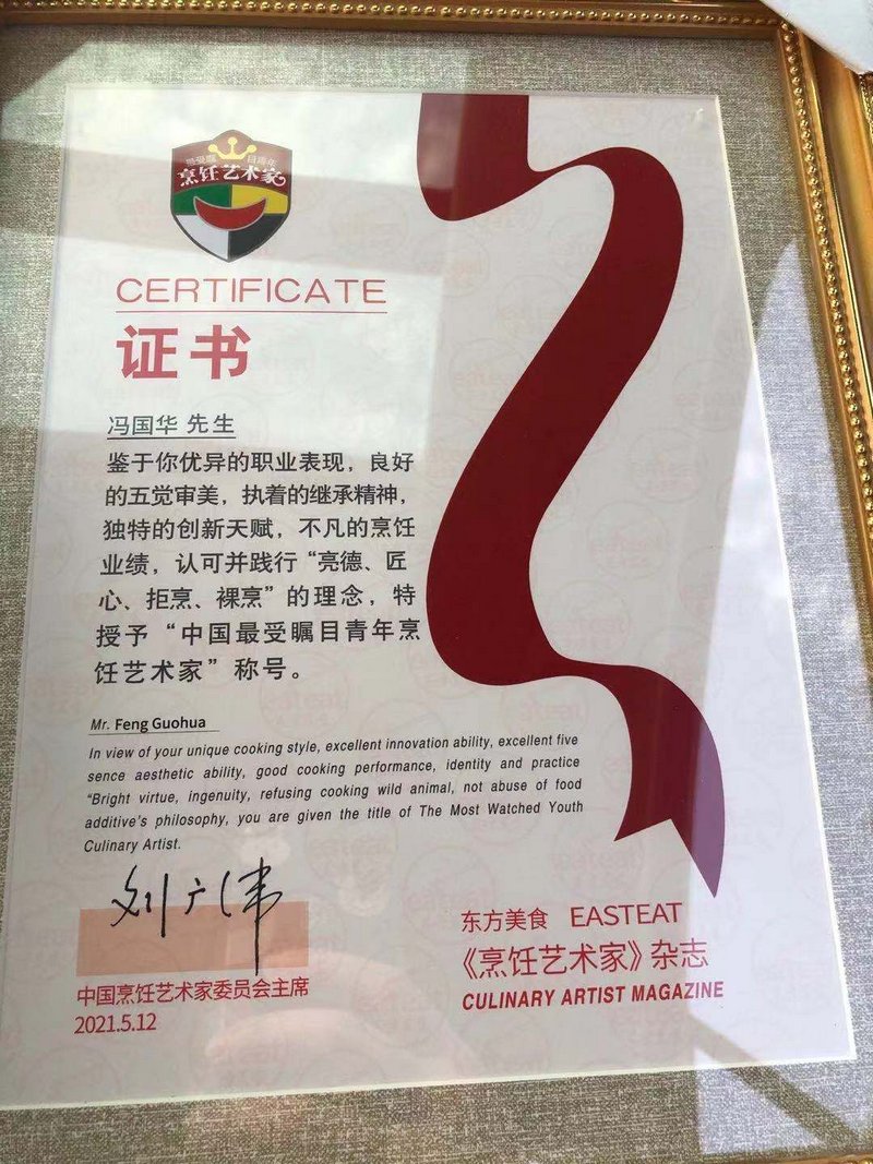 同時(shí)記者獲悉,在近期舉行的“首屆中國餐飲品牌集群大會(huì)暨第三屆中國餐飲產(chǎn)業(yè)品牌年會(huì)”上,農(nóng)耕記創(chuàng)始人、首席產(chǎn)品官、頭號(hào)好吃鬼馮國華榮獲東方美食2021年“中國最受矚目青年烹飪藝術(shù)家”稱號(hào)。該獎(jiǎng)項(xiàng)在業(yè)內(nèi)享有“中國餐飲行業(yè)奧斯卡”稱號(hào),候選人必需具有一定的烹飪藝術(shù)創(chuàng)造能力和烹飪藝術(shù)鑒賞能力,并愿意踐行“亮德、匠心、拒烹、裸烹”價(jià)值觀,且樂于傳承、分享、交流菜品技術(shù)。