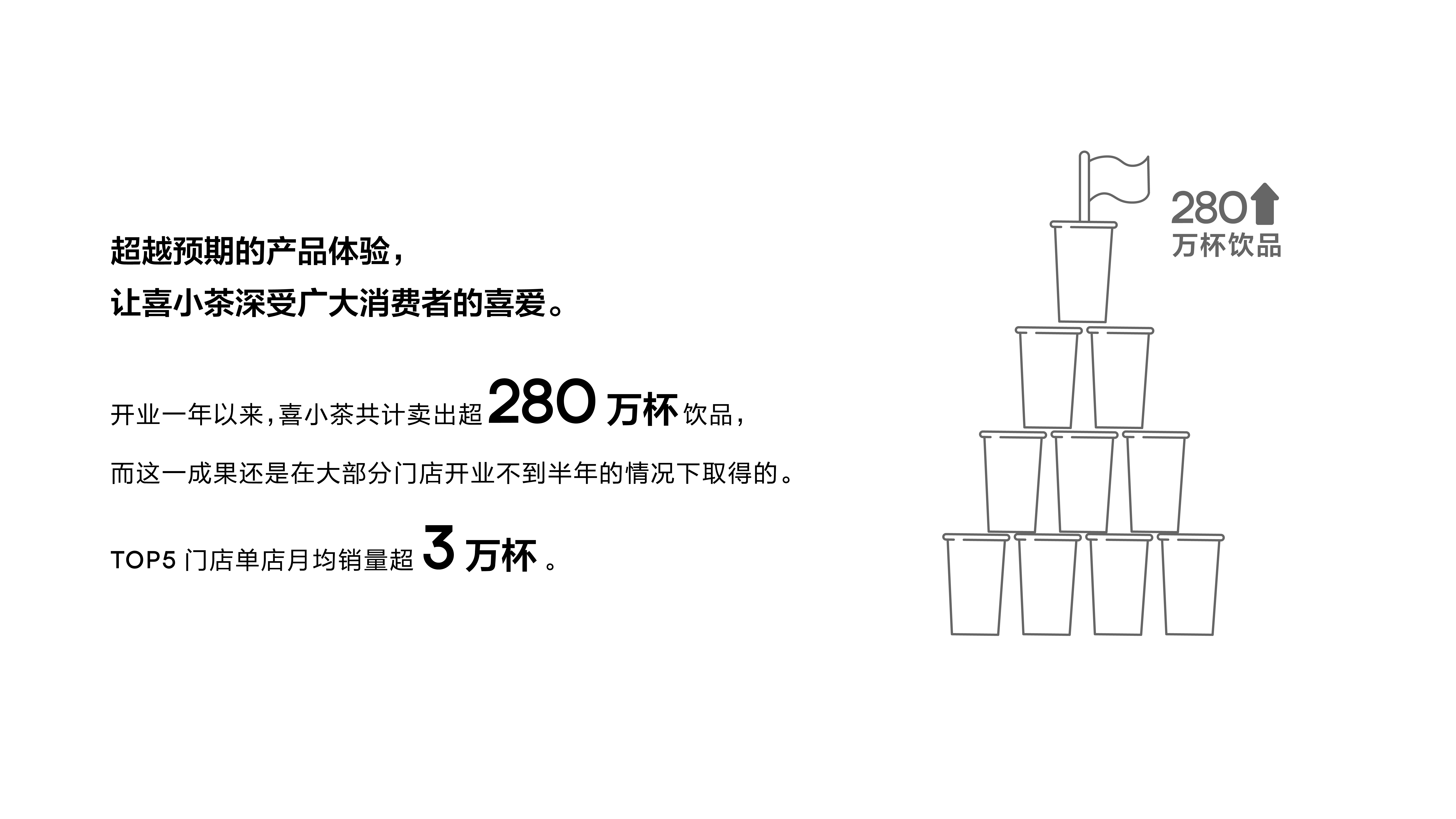 一年來,喜小茶在業(yè)態(tài)的探索與創(chuàng)新中,不斷積蓄品牌勢能,銷量也持續(xù)走高。報(bào)告顯示,過去一年,隨著門店先后開業(yè),客單價(jià)28元、杯均單價(jià)13元的喜小茶共計(jì)賣出超280萬杯飲品,而這個(gè)銷量還是在大部分門店開業(yè)時(shí)間不足半年的情況下達(dá)成的。