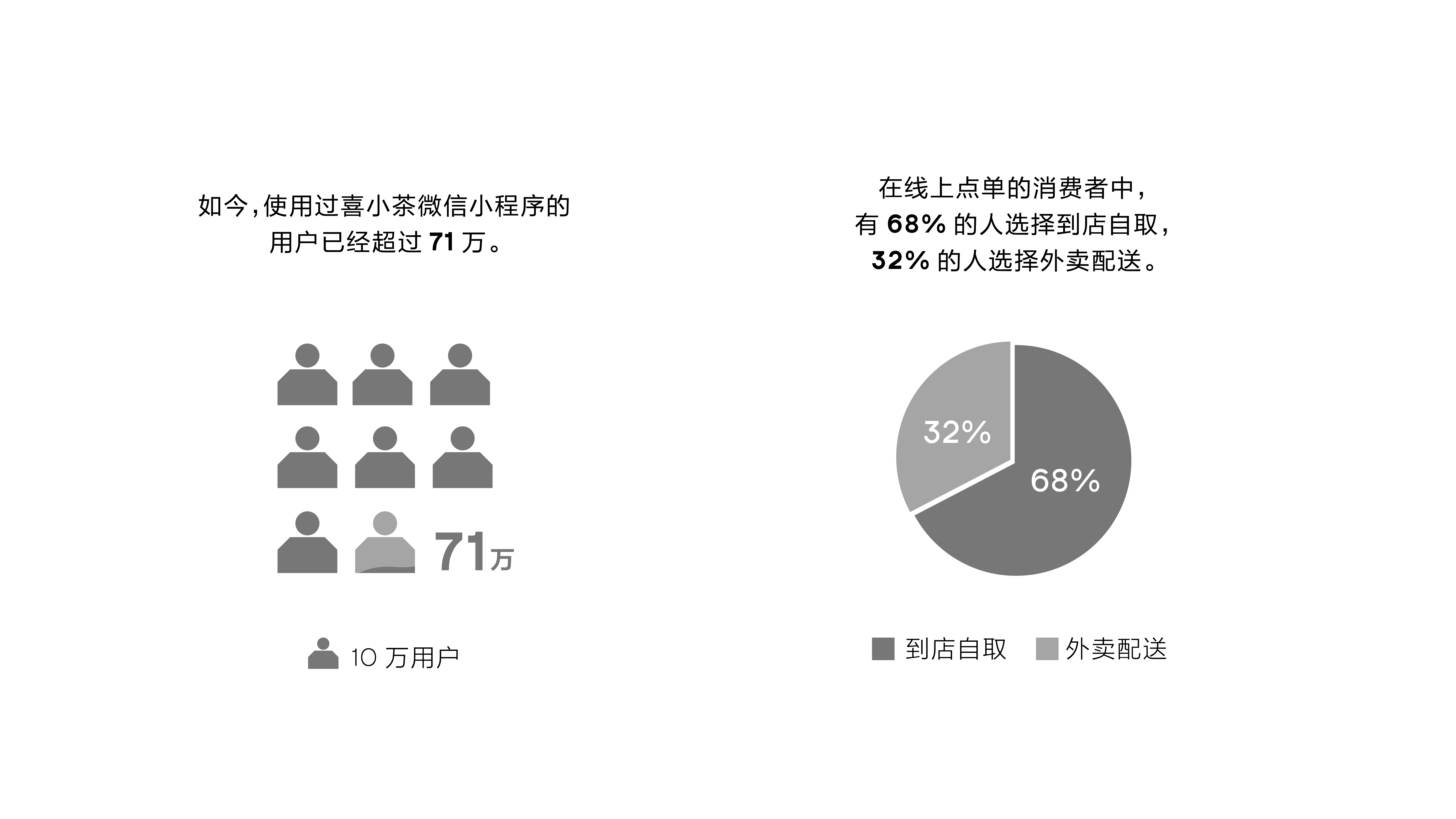 而在線上,通過數(shù)字化手段,喜小茶也讓更多的人接觸新茶飲。以外帶門店為主要形態(tài)的喜小茶,通過微信小程序這一數(shù)字化工具,為超過71萬的線上用戶提供了服務(wù)。在線上點(diǎn)單的消費(fèi)者中,外賣配送比例由去年底的12.6%提升至如今的32%。