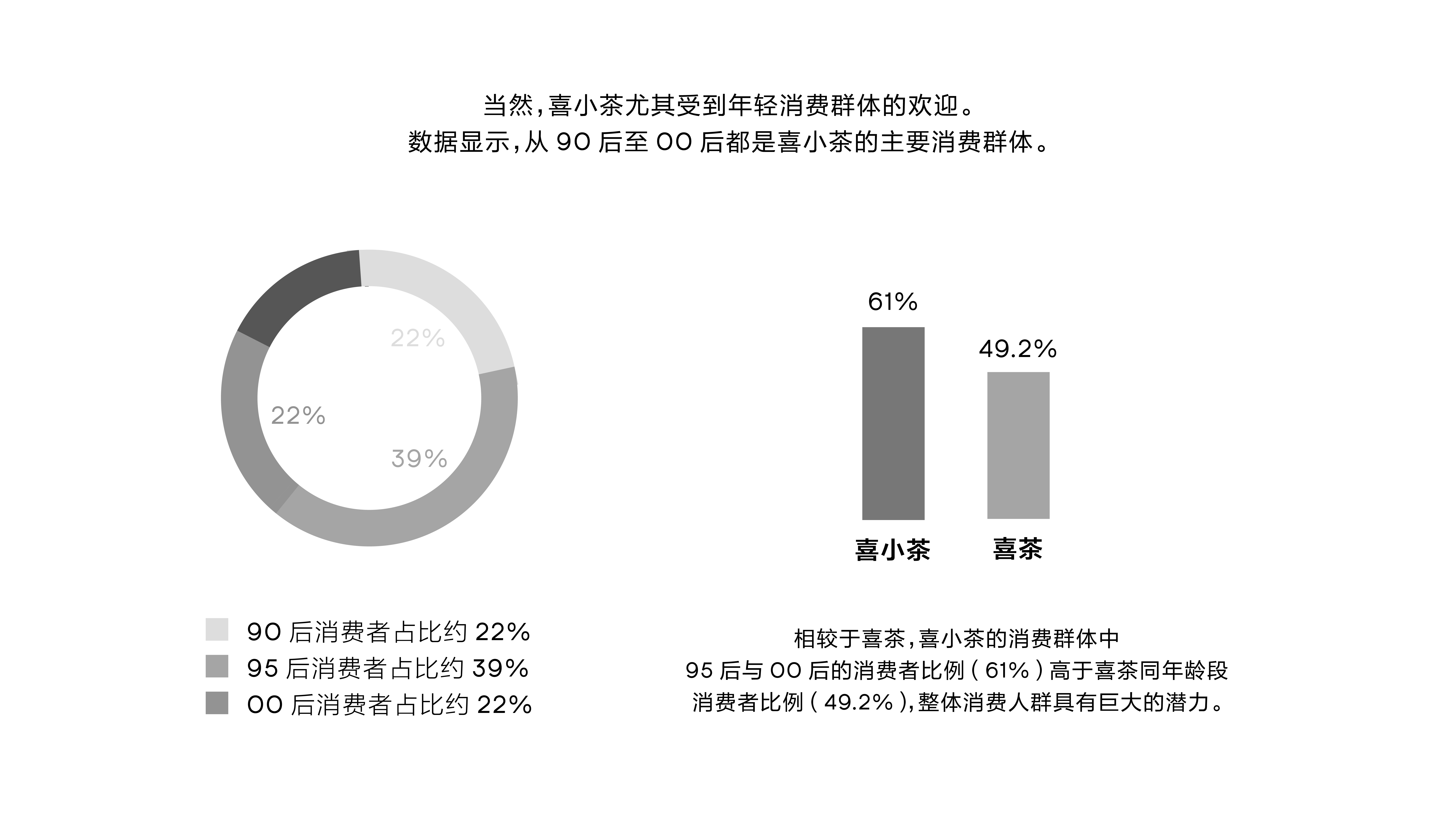報(bào)告顯示,年輕的喜小茶也更加受到同樣年輕的消費(fèi)群體的喜愛,相較于喜茶的消費(fèi)群體中占比49.2%的95后與00后,喜小茶的同年齡段消費(fèi)者比例達(dá)到61%。喜小茶90后消費(fèi)者占比約22%,95后消費(fèi)者占比約39%,00后消費(fèi)者占比約22%。整體消費(fèi)人群具有巨大的潛力。