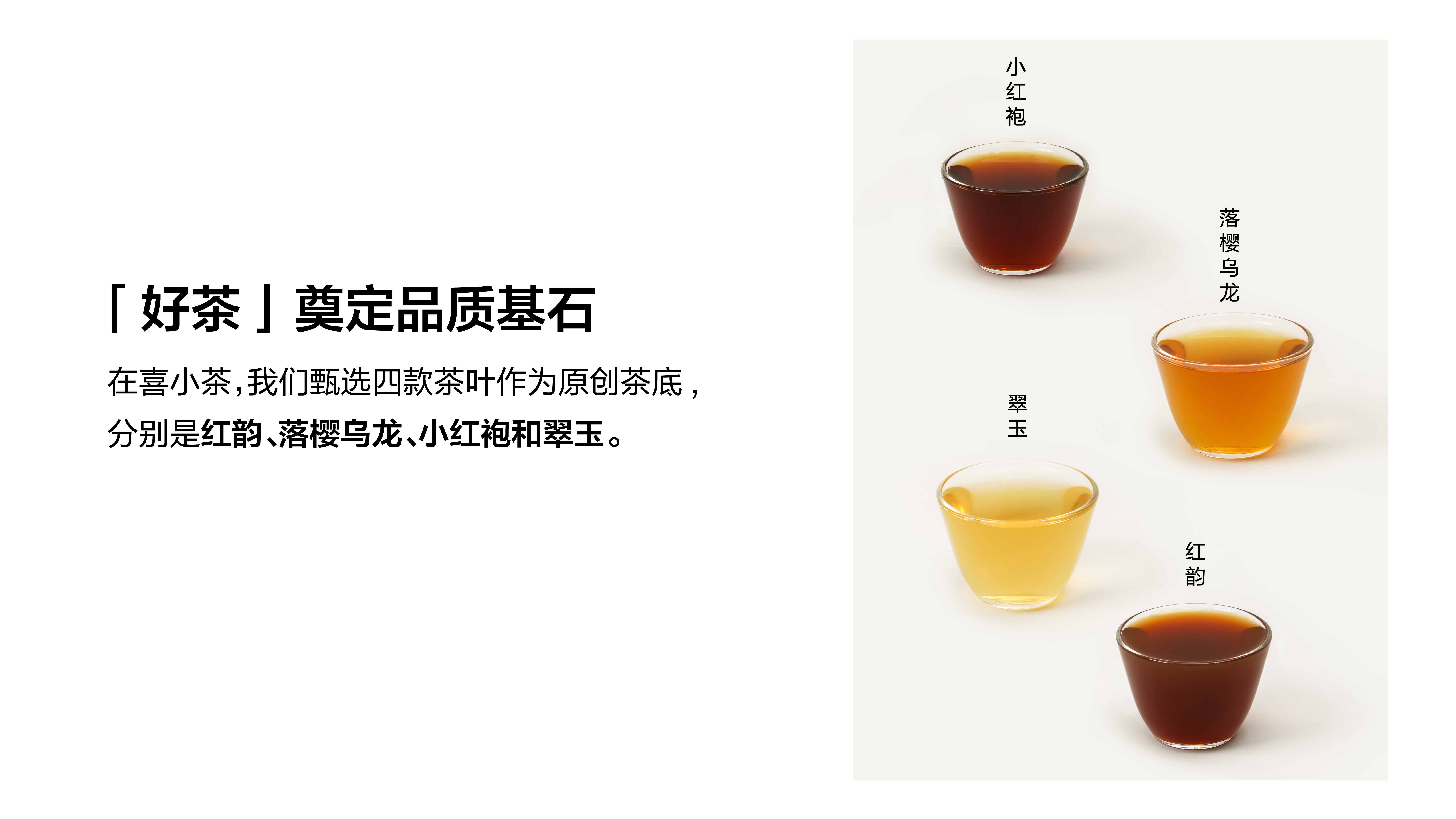 在茶葉上,目前喜小茶的紅韻、落櫻烏龍、小紅袍、翠玉四款原創(chuàng)茶底,為其“好茶真奶”奠定了品質(zhì)的基石。其中茶葉產(chǎn)自浙江、福建的“紅韻”,滋味甜醇、回甘生津,馥郁的花果香令人心神清明;產(chǎn)自福建南部經(jīng)典茶場的“落櫻烏龍”,以櫻花香氣而得名,口感清香順滑,暖喉回甘;同樣是來自福建的“小紅袍”巖韻明顯,蘭花香氣沁人心脾,口感醇厚自然;以及產(chǎn)自廣西橫縣的“翠玉”,融入了鮮靈的茉莉花香,清爽自然。