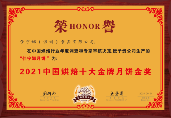 經(jīng)過(guò)多年的發(fā)展與沉淀,佳寧娜月餅以先進(jìn)的工藝、獨(dú)特的口味、卓越的信譽(yù)贏得消費(fèi)者的信賴(lài)和支持,曾榮獲“深圳老字號(hào)”“深圳月餅節(jié)質(zhì)量信譽(yù)獎(jiǎng)” (連續(xù)12年 )“中國(guó)食品安全年會(huì)食品安全示范單位”“中國(guó)烘焙五仁月餅金獎(jiǎng)”“中國(guó)烘焙廣式月餅金獎(jiǎng)”“中國(guó)烘焙潮式月餅金獎(jiǎng)”、“中國(guó)烘焙十佳名牌月餅”、“中國(guó)烘焙老字號(hào)月餅“等多項(xiàng)榮譽(yù)稱(chēng)號(hào)。