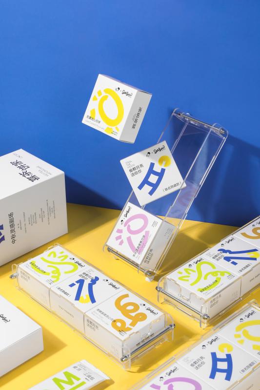 作為和Seesaw聯(lián)名的禮盒,為了增加互動感和cp感,喜茶將“偷顆月亮送給你”的主題在外包裝設計上加以延展,設定了“互偷月亮”的概念,將靈感注入外包裝設計中以圖形上的方圓結(jié)合、顏色上的簡約和諧,以及喜茶和Seesaw特有元素的交相呼應,為消費者帶來兼具互動性、包容性的視覺體驗。方圓的簡約圖形結(jié)合馬克筆筆跡式的設計元素,給人以想象空間。同時,結(jié)合代表“夜晚”的“藍色”和代表“月亮”的“黃色”這兩種顏色系統(tǒng)的運用,進一步對主題加以呈現(xiàn)。禮盒整體上則突破傳統(tǒng)的橫放型禮盒式樣,采用直立型包裝,令人耳目一新。每一處設計,都延續(xù)了喜茶靈感。