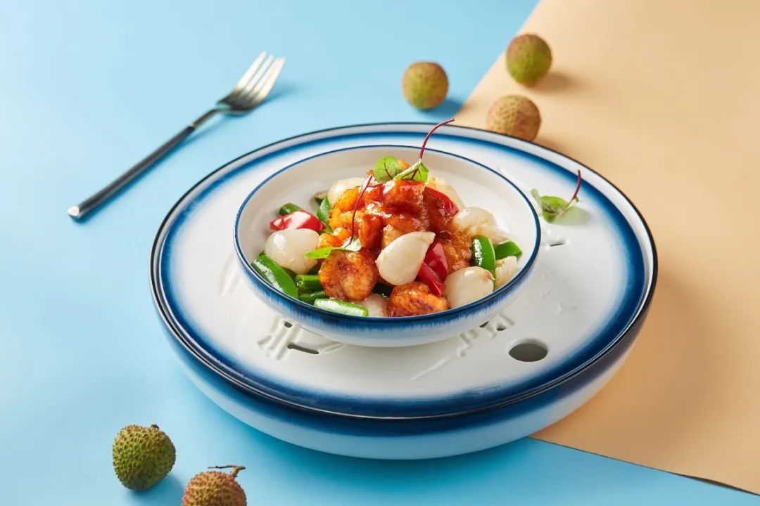 粵菜師傅巧妙設(shè)計(jì),將荔枝肉與蝦仁共燴——碧綠蝦仁炒荔枝肉。