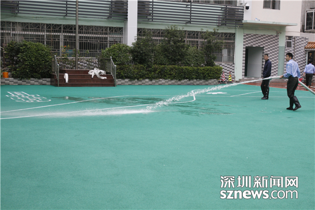 羅湖螺嶺外國語實(shí)驗學(xué)校二部通過沖水的方式,清除跑道的異味