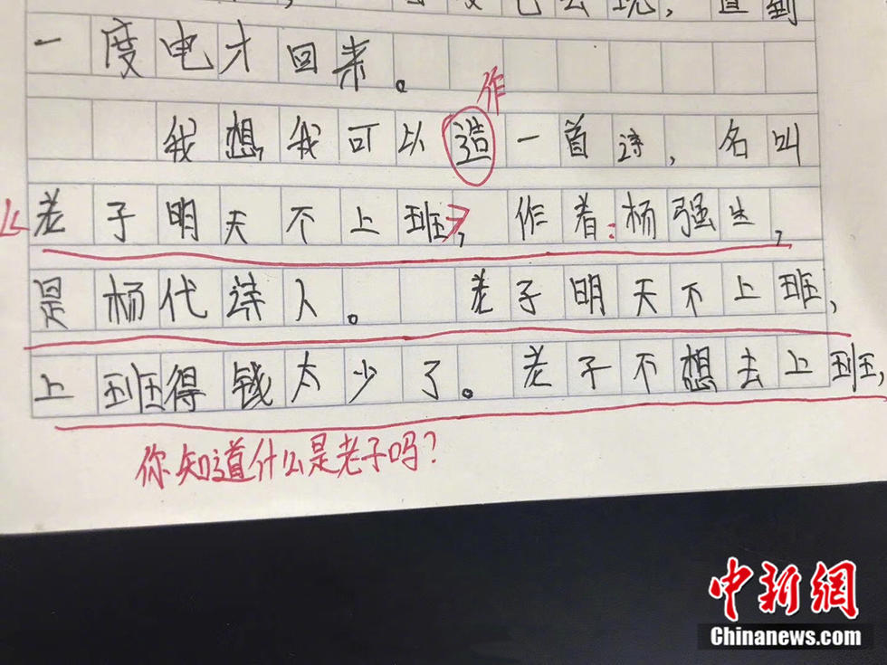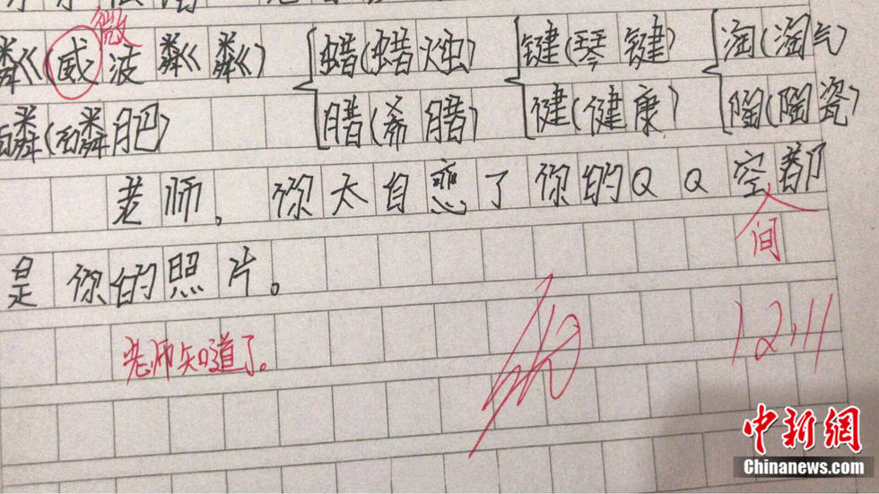 近日,貴州省谷隴翁板小學(xué)的語文老師張沁文,曬出了學(xué)生寫在作業(yè)里的“金句”?!袄蠋?,你太自戀了,QQ空間都是自己照片”;“顏值升高才有人喜歡您”……孩子們的童言無忌令人哭笑不得,老師的評論也很亮眼。