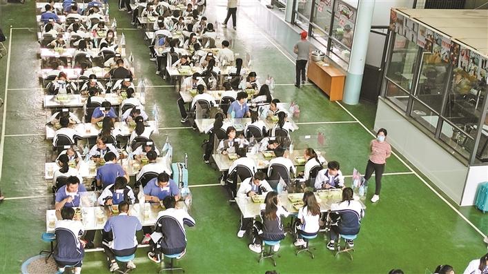 ▲4月27日,高三初三學(xué)生返校復(fù)學(xué)首日,梅林中學(xué)學(xué)生在飯?zhí)糜貌?。飯?zhí)妹總€(gè)座位都設(shè)有隔板。深圳晚報(bào)記者劉丹青攝