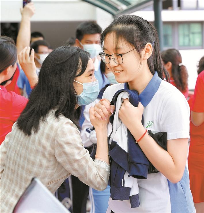 準備進入考場的育才中學考生與老師微笑握手,帶著老師的美好祝愿自信面對人生大考。深圳特區(qū)報記者周紅聲攝