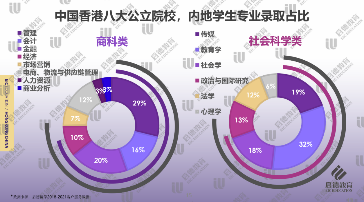 在社會科學(xué)類學(xué)科的細(xì)分專業(yè)中,教育學(xué)(32% )、傳媒(19% )和社會學(xué)(18% )的錄取占比較高。由于教育類專業(yè)在內(nèi)地就業(yè)形勢好,香港院校不僅教育學(xué)排名靠前,還擁有適合內(nèi)地學(xué)生的中文教育及對外漢語教育等課程,教育學(xué)專業(yè)在文科生中比重一直居于首位。隨著新媒體行業(yè)的崛起,處于亞洲龍頭地位的香港傳媒專業(yè)也是倍受歡迎。而“公考熱”的持續(xù)使得希望提升學(xué)歷背景的學(xué)生,會考慮繼續(xù)深造社會學(xué)、政治與國際研究此類課程。