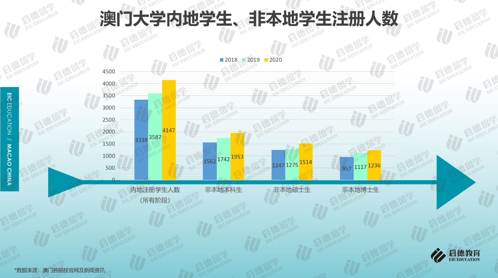 最近幾年,內(nèi)地學(xué)生赴澳門求學(xué)的人數(shù)保持增長(zhǎng),據(jù)澳門大學(xué)官網(wǎng)數(shù)據(jù)顯示,2020年,赴澳門大學(xué)求學(xué)的內(nèi)地注冊(cè)學(xué)生人數(shù)為4147人,相比2019年上漲了15.61%,相比2018年上漲了24.23%;2021/2022學(xué)年,澳門科技大學(xué)本科課程的內(nèi)地報(bào)名人數(shù)超過(guò)18000人,澳門城市大學(xué)本科課程的內(nèi)地報(bào)名人數(shù)接近13000人,計(jì)劃錄取866人,報(bào)錄比達(dá)到15:1。此外,2020年澳門大學(xué)本科(1953人)、碩士(1514人)、博士(1236人)階段的非本地生人數(shù)均呈穩(wěn)步上升,非本地學(xué)生包括來(lái)自中國(guó)內(nèi)地及其它國(guó)家與地區(qū)的學(xué)生。澳門高等院校的申請(qǐng)競(jìng)爭(zhēng)遠(yuǎn)比想象中激烈。