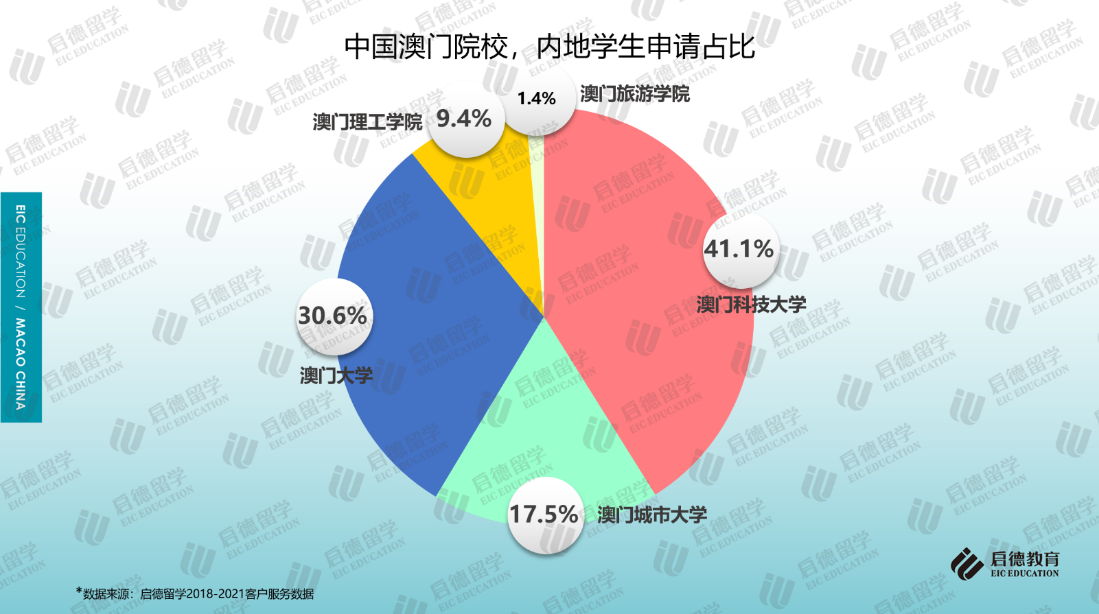啟德留學(xué)2018-2021客戶服務(wù)數(shù)據(jù)顯示,澳門地區(qū)高校的申請(qǐng)中,七成以上申請(qǐng)澳門科技大學(xué)(41.1%)和澳門大學(xué)(30.6%);作為私立院校的澳門城市大學(xué)因?qū)W科設(shè)置比較全面,申請(qǐng)占比為17.5%;作為公立院校的澳門理工學(xué)院(9.4%)、澳門旅游學(xué)院(1.4%)由于專業(yè)設(shè)置較少,申請(qǐng)占比相對(duì)較少。從啟德留學(xué)澳門地區(qū)高校的錄取數(shù)據(jù)來(lái)看,澳門科技大學(xué)的錄取占比為60%,澳門大學(xué)的錄取占比為14%,澳門城市大學(xué)、澳門理工學(xué)院、澳門旅游學(xué)院的錄取占比分別為21%、3%與2%。
