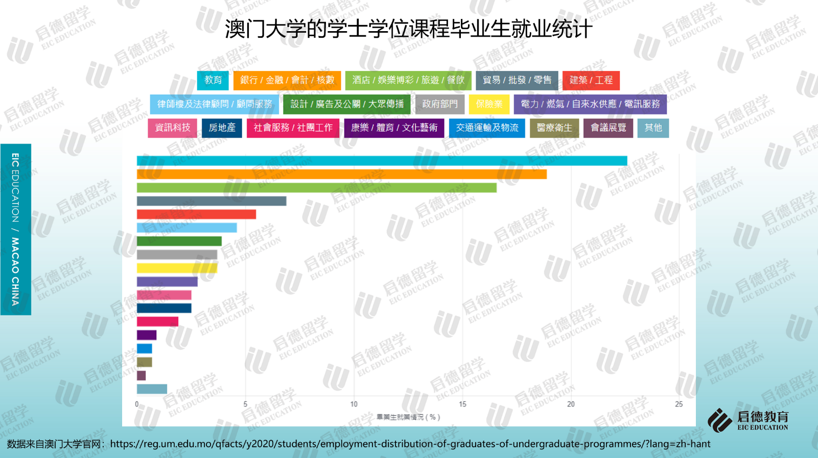 澳門大學(xué)2019/2020年本科畢業(yè)生就業(yè)調(diào)查顯示,畢業(yè)生就業(yè)人數(shù)最多的行業(yè)排名前三位為教育行業(yè)(22.6%)、銀行/金融/會(huì)計(jì)/核數(shù)(18.9%)、酒店/娛樂博彩/旅游/餐飲(16.6%)。澳門科技大學(xué)2018/2019學(xué)年本科畢業(yè)后去向調(diào)查顯示,就業(yè)的本地生中,4.2%選擇在內(nèi)地工作;就業(yè)的非本地生中,在粵港澳大灣區(qū)工作的約占54.3%。本科升學(xué)后去向調(diào)研顯示,除了中國(guó)澳門(25.1%)外,英國(guó)(31.9%)、澳大利亞(15.8%)、中國(guó)香港(7.5%)、美國(guó)(5.7%)、新加坡(3.6%)也是主要升學(xué)地區(qū)。