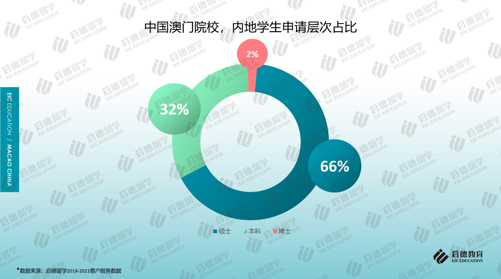 啟德留學(xué)2018-2021客戶服務(wù)數(shù)據(jù)顯示,前往澳門求學(xué)的內(nèi)地學(xué)生選擇攻讀碩士的比例較高,且申請(qǐng)量呈現(xiàn)逐年小幅上升的趨勢(shì),2021年為66%;攻讀本科的占比超過(guò)30%,除高考生外,今年也開始有參加國(guó)際考試的內(nèi)地學(xué)生申請(qǐng)澳門的高校。QS官網(wǎng)2021年數(shù)據(jù)顯示,澳門大學(xué)非本地生(3921人)中研究生與本科生的占比分別為55%與45%;澳門科技大學(xué)非本地生(8869人)中,研究生與本科生的占比分別為32%與68%。