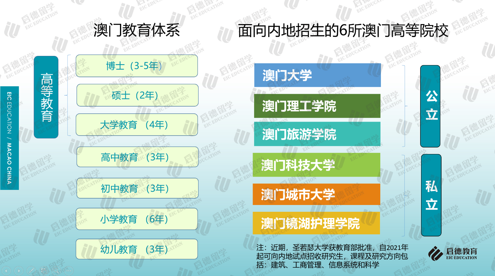 作為中西文化交匯的國(guó)際旅游城市,中國(guó)澳門的輕工業(yè)、旅游業(yè)、酒店業(yè)和娛樂場(chǎng)使其成為中外游客青睞的旅游度假勝地。澳門與香港同樣都具有獨(dú)特的地緣優(yōu)勢(shì),既有中國(guó)文化的根基,又融會(huì)貫通了歐美教育的優(yōu)勢(shì),中文、葡文、英文學(xué)制并存的多語(yǔ)言教學(xué)與多元文化交融的國(guó)際化環(huán)境,為學(xué)生提供了開闊的國(guó)際視野和學(xué)術(shù)氛圍,也為當(dāng)?shù)馗叩冉逃陌l(fā)展創(chuàng)造了良好的條件。目前,澳門大學(xué)、澳門理工學(xué)院、澳門旅游學(xué)院、澳門城市大學(xué)、澳門鏡湖護(hù)理學(xué)院、澳門科技大學(xué)等6所高校獲教育部批準(zhǔn)可面向內(nèi)地招收本科生及研究生,圣若瑟大學(xué)獲教育部批準(zhǔn)自2021年起可面向內(nèi)地試點(diǎn)招收研究生。