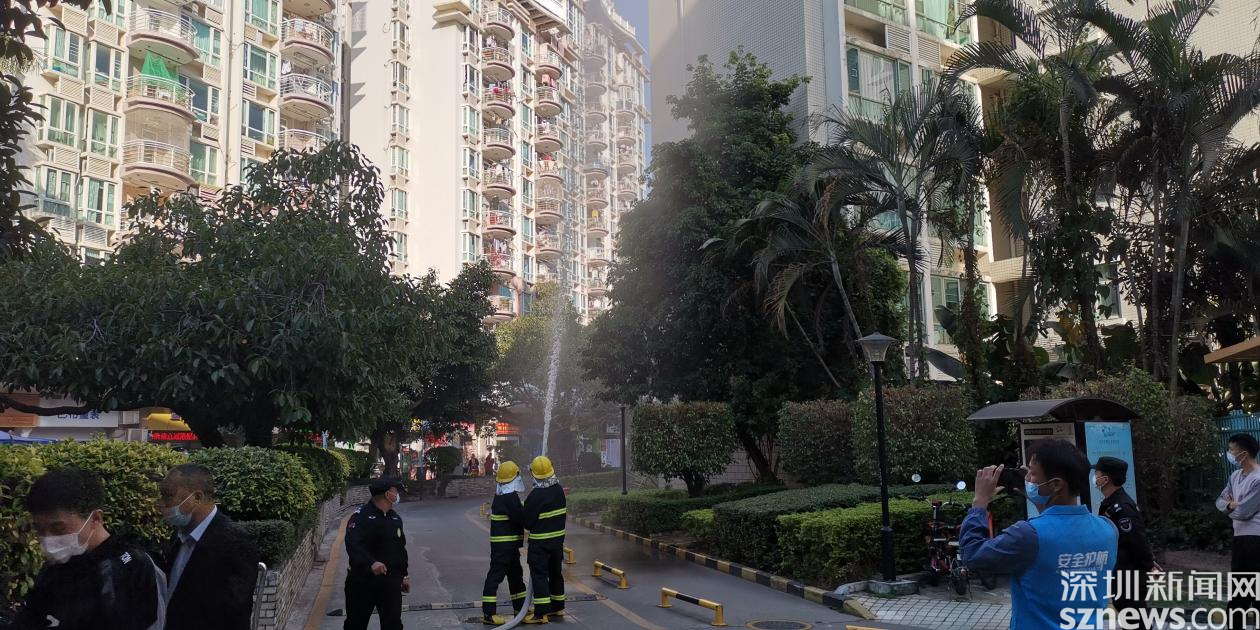 演練情景設(shè)定為巡查人員發(fā)現(xiàn)火情,第一時間向社區(qū)安全相關(guān)負(fù)責(zé)人匯報,安保處立刻報警并啟動消防應(yīng)急預(yù)案。隨后火警警報驟響,樓道內(nèi)冒出濃煙,疏散演練正式開始。居民們在工作人員的指揮下,用口罩、衣服等捂口鼻,屈膝彎腰沿著既定的疏散路線,迅速向安全區(qū)域撤離。隨后社區(qū)消防員趕赴現(xiàn)場,使用高壓水槍撲滅火災(zāi),解除警報。演練結(jié)束后,社區(qū)還組織居民參加安全體驗活動。