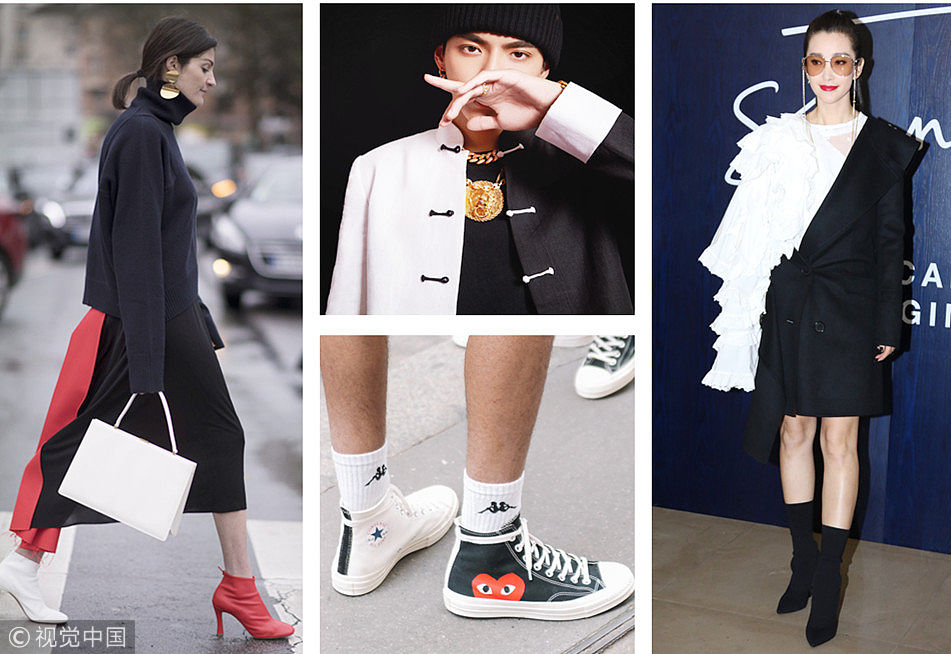 ????從Nike AJ1鴛鴦鞋的穿搭,到吳亦凡在某節(jié)目里一身黑白太極西裝炸翻全場(chǎng),似乎混潮圈的人沒(méi)有不穿鴛鴦色的。不對(duì)稱拼色設(shè)計(jì)怕是會(huì)逼“死”強(qiáng)迫癥,但你不得不承認(rèn)鴛鴦色的拉轟吸睛功力,想要在街頭上獨(dú)樹一幟鴛鴦色不會(huì)讓你失望。(圖片來(lái)源:視覺(jué)中國(guó))