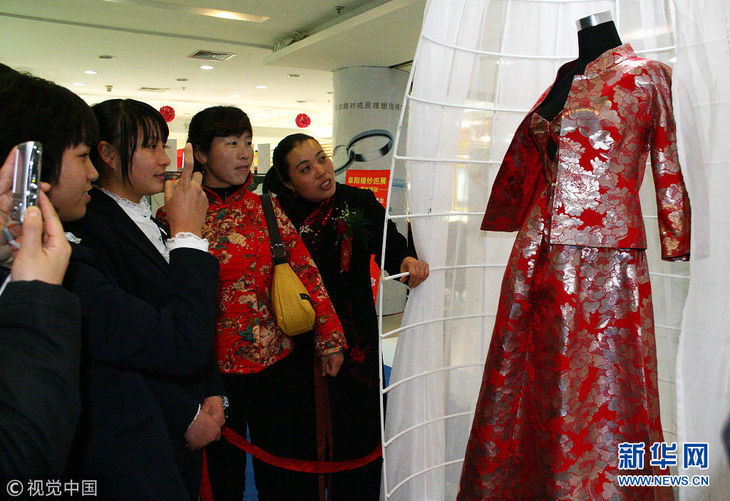 ????2007年11月16日 , 在安徽阜陽一家商場, 一款由鉑金制成的婚紗吸引了人們的眼球。據(jù)介紹,這種鑲有鉑金的婚紗是由國際鉑金協(xié)會特別訂制,全球只有紅色、白色和紫色三款。(圖片來源:視覺中國)