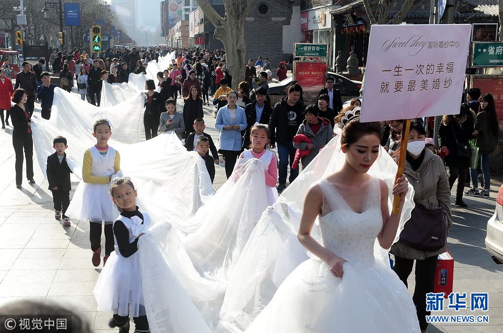 ????2016年3月13日,濟南商業(yè)街泉城路,一位模特身穿101米長的婚紗行走亮相,震驚路人。據(jù)負責(zé)展覽的婚紗中心介紹,這套婚紗長度101米,寓意百里挑一,耗資30多萬元專門定制的。(圖片來源:視覺中國)