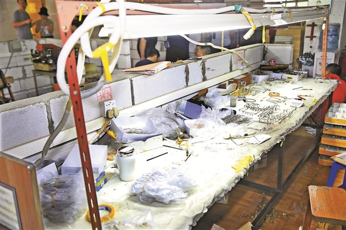 ????▲民警在工廠眼鏡組裝間查獲半成品眼鏡。