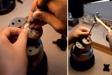 ????制作時(shí),首先在厚度僅為1 - 2毫米的金屬表盤表面依照?qǐng)D案紋路設(shè)計(jì),雕刻出深度僅為0.2 – 0.4毫米的凹槽,然后將金絲嵌入凹槽中,捶打壓實(shí),最后再對(duì)表盤進(jìn)行拋光打磨,使其光滑平整。熱衷于寶珀的高級(jí)定制腕表的收藏家們,可自行設(shè)計(jì)金屬鑲嵌圖案,亦可增添三維設(shè)計(jì)元素,以營(yíng)造作品的立體美感。