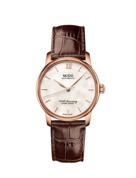 貝倫賽麗系列100周年限量款女士腕表擁有經(jīng)典、雅致的線條感,完美體現(xiàn)了瑞士美度表品牌歷經(jīng)歲月沉淀的經(jīng)典風(fēng)格與日漸精益的制表工藝。由PVD鍍玫瑰金不銹鋼表殼環(huán)繞其中的白色珍珠貝母表盤,盡顯高雅亮潔之姿。飽滿渾圓的葉形時針和分針經(jīng)過沖壓工藝處理,搭配PVD鍍玫瑰金立體鑲嵌刻度,將精致典雅隱藏于細(xì)節(jié)之中。透過其雙面鍍防眩目涂層藍寶石玻璃表鏡,表盤精美非凡的細(xì)節(jié)展露無遺;搭配做工細(xì)膩的棕色小牛皮軋鱷魚紋表帶,于復(fù)古典雅間,盡情釋放溫婉女性的曼妙風(fēng)韻。