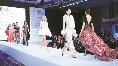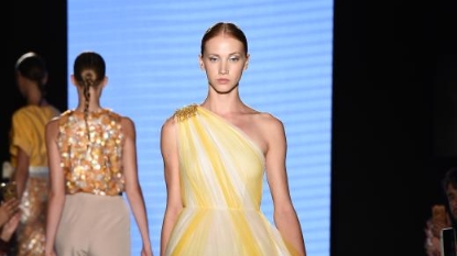 他的第二組造型則主打純粹的搖滾晚裝,尤其是個(gè)性十足的尖角翻領(lǐng)晚裝夾克。中國風(fēng)提花夾克背面繡有飛鳥,裝飾著水晶和亮片紋路。夾克上裝點(diǎn)著粉色和青綠色的云朵,綢緞尖角翻領(lǐng)處則點(diǎn)綴著手工縫制的水晶和亮片。不同配色的褲裝兩側(cè)均飾有亮片條紋。其余晚裝夾克也呈現(xiàn)了多元的印花與圖案,包括全身花卉刺繡、幾何圖案等,水晶和天鵝絨飾邊則更顯奢華。