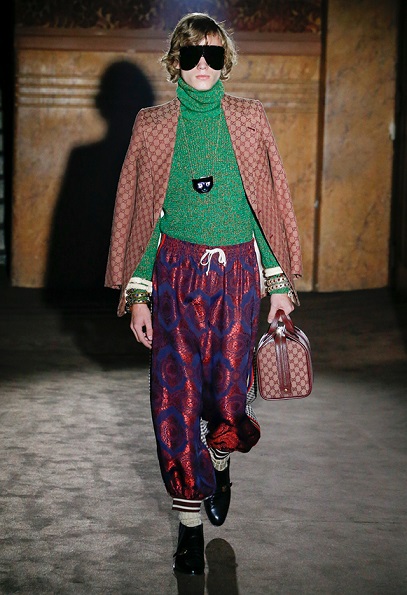 蔡依林穿著Gucci2019早春系列Look11金屬質(zhì)感印花上衣,雙G印花運動長褲,搭配拼接撞色高跟鞋,水晶細節(jié)耳墜及金屬大框眼鏡,手拿虎頭裝飾皮革肩背包。