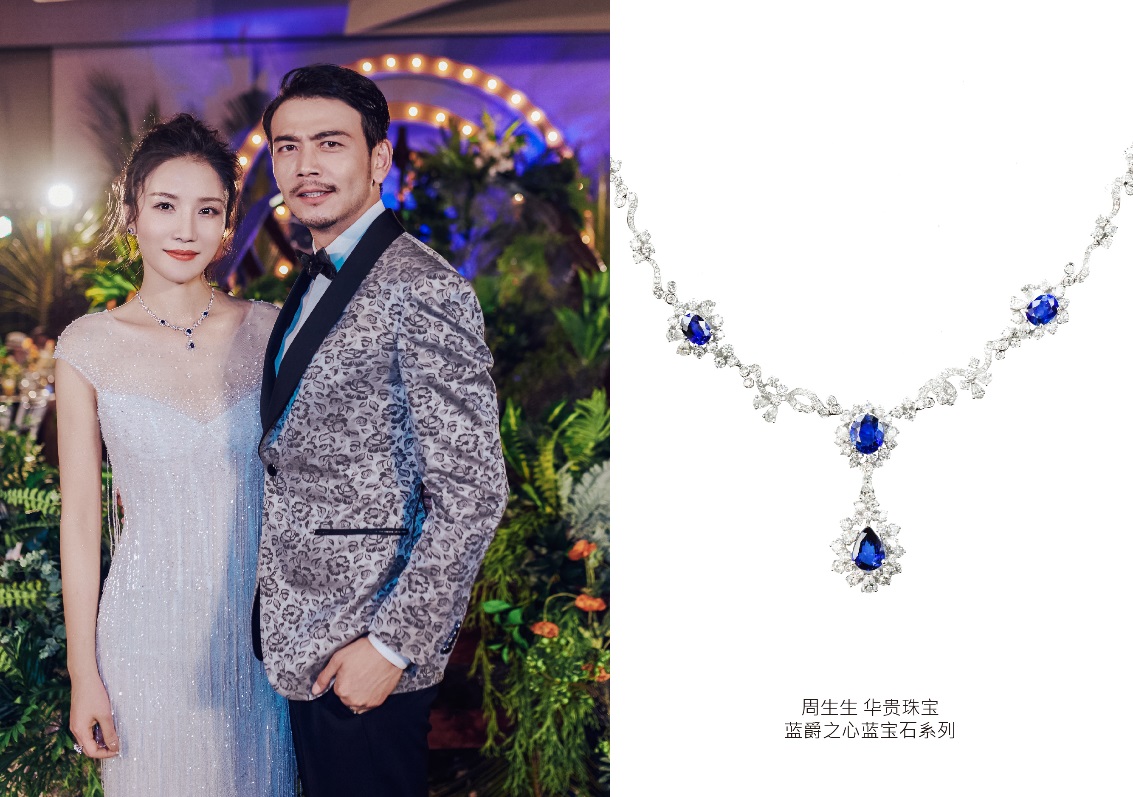夜幕降臨,璀璨煙花在夜空燃起,為愛綻放。五彩斑斕的煙火下,新娘王黎雯以一身優(yōu)雅長裙搭配周生生華貴珠寶“藍爵之心”藍寶石系列飾品步入晚宴現(xiàn)場,光彩照人而不失典雅氣質(zhì)。深邃奪目的藍寶石項鏈,搭配耳畔間藍寶石耳環(huán),如星光折射到海水上般熠熠生輝。在西方傳統(tǒng)習俗中,婚禮上擁有 S omething blue代表著幸運和忠貞的愛。“藍爵之心”那一抹動人心魄的藍色,傳承西方王室的尊榮,見證楊爍王黎雯夫婦愛之純粹雋永。