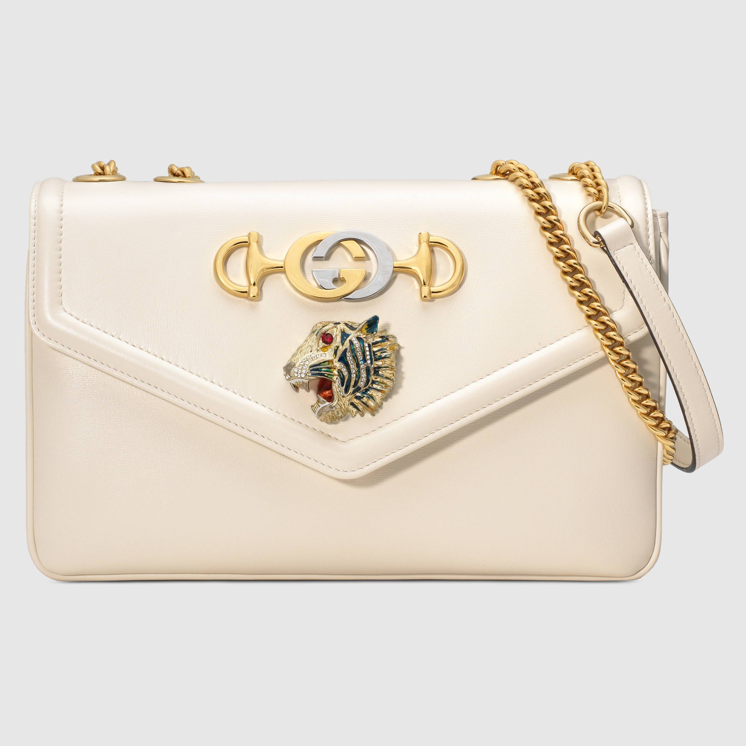 中號(hào)皮革肩背包搭配水晶鑲嵌虎頭標(biāo)識(shí)與金屬滑鏈肩帶,兼具摩登與復(fù)古的多款皮革配色,彰顯品牌崇尚自我表達(dá)的多元美學(xué)。