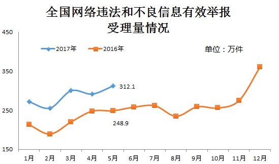 5月份,各地網(wǎng)信辦各網(wǎng)站深入貫徹落實(shí)2017年全國網(wǎng)絡(luò)舉報(bào)工作會議暨第三批百家網(wǎng)站公布舉報(bào)受理方式會議精神,同時在“六一”國際兒童節(jié)到來前,進(jìn)一步加大對網(wǎng)上違法和不良信息,特別是淫穢色情等嚴(yán)重危害青少年身心健康有害信息的處置力度,受理違法和不良信息有效舉報(bào)312.1萬件,環(huán)比、同比分別增長約7.1%和25.4%。