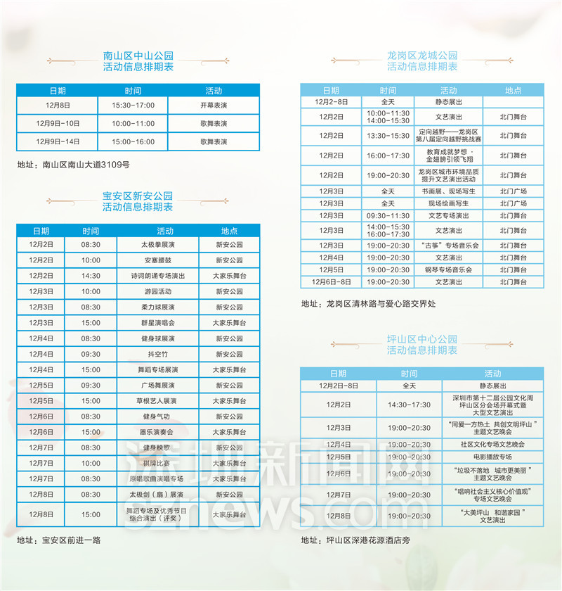 本屆公園文化周共設(shè)27個(gè)會(huì)場(chǎng),其中市屬公園設(shè)11個(gè)會(huì)場(chǎng),區(qū)屬公園設(shè)16個(gè)會(huì)場(chǎng),這也是公園文化周自舉辦以來(lái)承辦會(huì)場(chǎng)最多的一屆。其中,福田區(qū)首次參與公園文化周,該區(qū)紅樹(shù)林生態(tài)公園以及今年新開(kāi)放的香蜜公園均參與了本次活動(dòng)。此外,坪山區(qū)的聚龍山生態(tài)公園,龍華區(qū)的龍華人民廣場(chǎng)、觀瀾人民公園、龍華公園、德逸公園、勞動(dòng)者廣場(chǎng)均是首次參與“公園文化周”的承辦,讓更多市民在家旁邊就感受到公園文化和公園的建設(shè)成果。