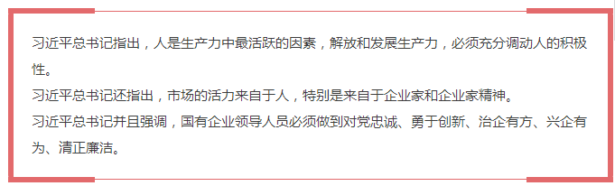 中國(guó)特色社會(huì)主義進(jìn)入新時(shí)代,建設(shè)現(xiàn)代化經(jīng)濟(jì)體系,推動(dòng)經(jīng)濟(jì)發(fā)展質(zhì)量變革、效率變革、動(dòng)力變革,需要更好發(fā)揮包括國(guó)有企業(yè)家在內(nèi)的廣大企業(yè)家的作用。去年黨中央專門(mén)印發(fā)了《關(guān)于營(yíng)造企業(yè)家健康成長(zhǎng)環(huán)境,弘揚(yáng)企業(yè)家精神、更好發(fā)揮企業(yè)家作用的意見(jiàn)》,極大地調(diào)動(dòng)了企業(yè)家干事創(chuàng)業(yè)的積極性。落實(shí)好中央精神,關(guān)心愛(ài)護(hù)企業(yè)家,需要各方面共同努力。