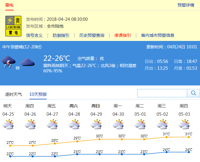 深圳新聞網(wǎng)訊(記者 許可馨)據(jù)“深圳氣象臺”最新播報(bào):預(yù)計(jì)24日陰天有雷陣雨,有時雨勢較大,氣溫下降;25日降雨結(jié)束,轉(zhuǎn)多云,可見陽光;26-30日多云,中午前后天氣炎熱。??