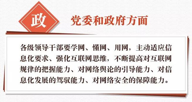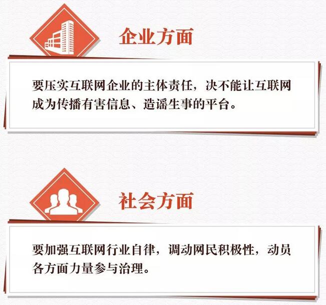要形成黨委領導、政府管理、企業(yè)履責、社會監(jiān)督、網民自律等多主體參與,經濟、法律、技術等多種手段相結合的綜合治網格局。要加強網上正面宣傳,積極培育和踐行社會主義核心價值觀。