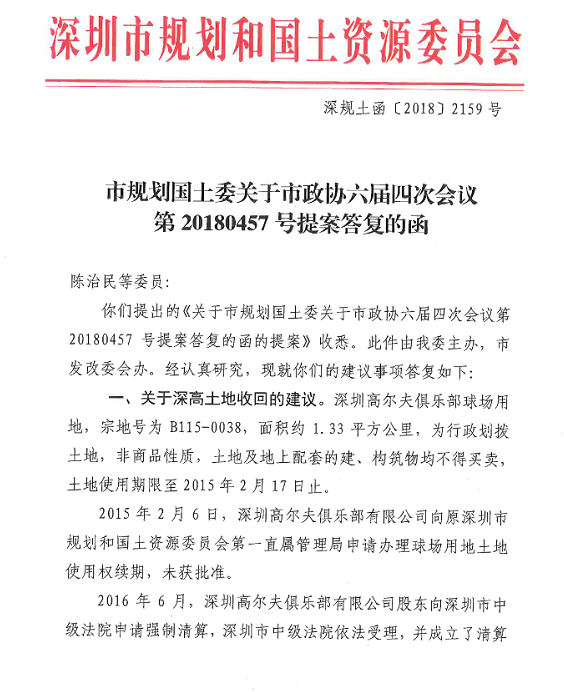 深圳新聞網(wǎng)記者注意到,2018年6月21日規(guī)土委給陳治民等政協(xié)委員的回復(fù)函中,將深圳高爾夫俱樂部球場用地到期后發(fā)生的事情,一一列了出來: