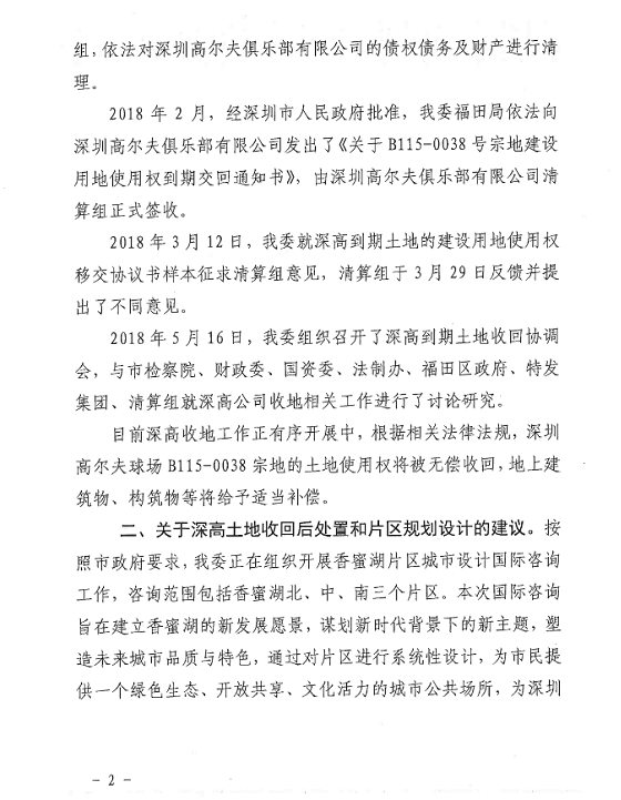 2018年2月,經(jīng)深圳市人民政府批準,深圳市規(guī)土委依法向深圳高爾夫俱樂部有限公司發(fā)出了《關(guān)于B0015-0038宗地建設(shè)用地使用權(quán)到期交回通知書》,由深圳高爾夫俱樂部有限公司清算組正式簽收。