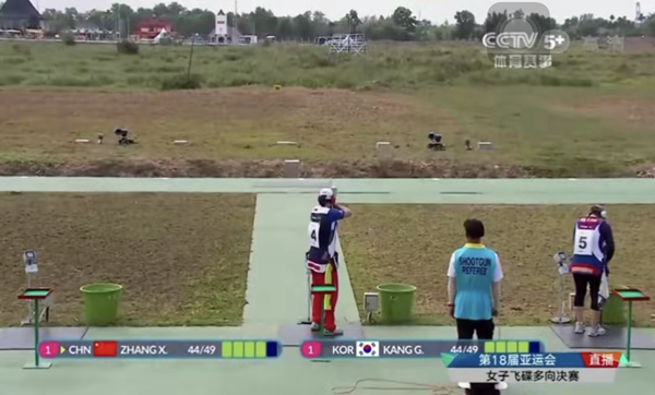 8月20日,龍崗運(yùn)動(dòng)員張?chǎng)吻飱Z得2018年雅加達(dá)亞運(yùn)會(huì)射擊賽場(chǎng)展開(kāi)女子飛碟多向個(gè)人賽冠軍。(央視視頻截圖)