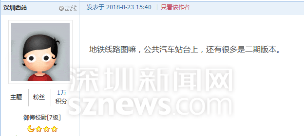 就此,網(wǎng)友“香滿樓”吐槽相關(guān)部門只管建設(shè),不管維護(hù)保養(yǎng)。網(wǎng)友“深圳西站”同時(shí)反映,深圳公共汽車站臺上,還有很多地鐵路線圖是二期版本。