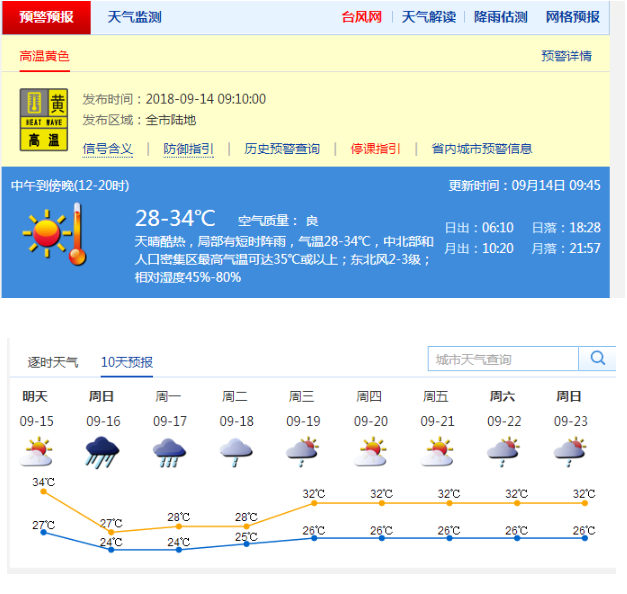 【深圳市高溫黃色預(yù)警】深圳市氣象臺(tái)于2018年09月14日09時(shí)10分在全市陸地發(fā)布高溫黃色預(yù)警,預(yù)計(jì)14日我市最高氣溫將升至35℃以上,信號(hào)可能持續(xù)2天,做好防暑降溫工作,避免長時(shí)間戶外或者高溫條件下的作業(yè)。