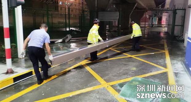 皇崗邊檢站五、六隊的執(zhí)勤民警依舊在室外執(zhí)行監(jiān)護任務,大風把他們的身體吹彎了。更危險的時刻來臨,狂風將玻璃窗吹倒,玻璃渣碎落一地,執(zhí)勤民警第一時間上前清理,保障車輛通行安全,直到隱患排除后才發(fā)現(xiàn)雙手早已被細碎的玻璃劃得鮮血直流。