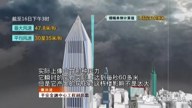 截至16日下午3時,監(jiān)測到臺風(fēng)‘山竹’的最大風(fēng)速為47.8米/秒,平均風(fēng)速為30至35米/秒。根據(jù)監(jiān)測數(shù)據(jù)推算,塔頂擺幅不超過單側(cè)30厘米,也就是說還不到設(shè)計值的50%。