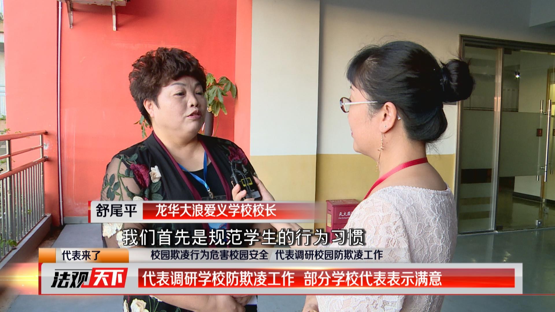 龍華大浪愛(ài)義學(xué)校,2016年12月份曾經(jīng)發(fā)生過(guò)學(xué)生被逼下跪自扇巴掌的惡性校園事件。而在該事件發(fā)生之后,學(xué)校就自發(fā)成立了教師督導(dǎo)隊(duì),加強(qiáng)上下學(xué)期間校園周邊的巡查力度,及時(shí)排查隱患,防止校園欺凌事件的再次發(fā)生。胡春華、肖莉珍、宋敏三位人大代表在龍華大浪愛(ài)義學(xué)校內(nèi)視察調(diào)研,他們發(fā)現(xiàn)該學(xué)校防校園欺凌的宣傳工作值得點(diǎn)贊。龍華大浪愛(ài)義學(xué)校校長(zhǎng)舒尾平告訴人大代表,在防止校園欺凌的問(wèn)題上是非常積極去面對(duì)的,召開(kāi)主題班會(huì)、宣傳公告、設(shè)置舉報(bào)信箱等,特別注重德育,引導(dǎo)孩子們注重品德,友愛(ài)相處,從根源上杜絕校園欺凌。