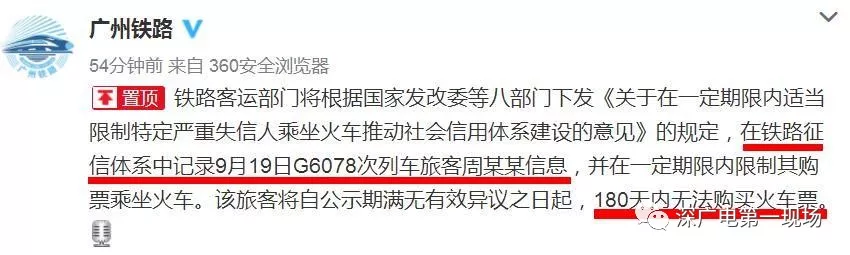 據(jù)@廣州鐵路今天上午10點25分通報稱,鐵路客運部門將根據(jù)國家發(fā)改委等八部門下發(fā)《關(guān)于在一定期限內(nèi)適當(dāng)限制特定嚴重失信人乘坐火車推動社會信用體系建設(shè)的意見》的規(guī)定,在鐵路征信體系中記錄9月19日G6078次列車旅客周某某信息,并在一定期限內(nèi)限制其購票乘坐火車。