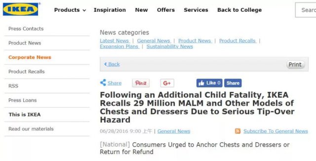 2016年6月28日,宜家開始在美國和加拿大市場召回馬爾姆(Malm)抽屜柜。