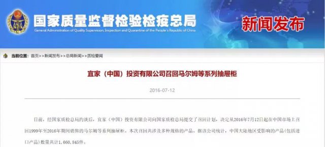 2016年7月12日,國家質(zhì)檢總局官網(wǎng)宣布,經(jīng)約談后,宜家(中國)投資有限公司向國家質(zhì)檢總局提交了召回計劃,決定在中國市場上召回1999年至2016年期間銷售的馬爾姆等系列抽屜柜。本次召回中國大陸地區(qū)受影響的產(chǎn)品 (包括進(jìn)口產(chǎn)品 )數(shù)量共166萬件。