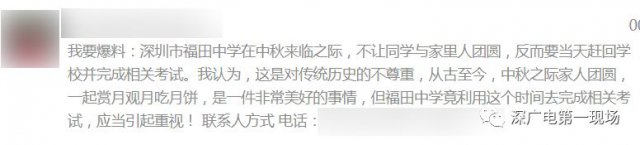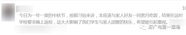今天,深圳市高級中學(xué)、深圳市福田中學(xué)、沙井中學(xué)、東方英文書院的一些高中學(xué)生,通過在線留言等多種方式,向欄目反映,中秋節(jié)是法定假日,但他們卻沒法和家人一起吃飯團聚,更別提賞月看晚會了,原因是學(xué)校要求寄宿的學(xué)生今天晚上要提早返校,參加晚自習或者考試。