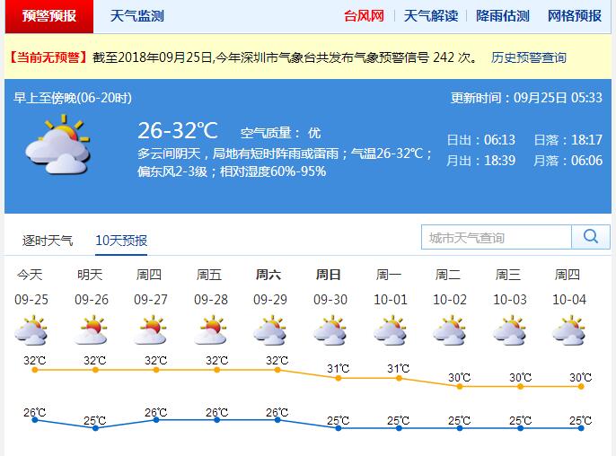 市氣象臺預測,26日,受偏東氣流影響,多云間陰天,有短時雷陣雨,氣溫為25-32℃。27日起,轉(zhuǎn)東北風影響,天氣晴朗,最高氣溫32-33℃。預計超強臺風“潭美”將趨向呂宋島以東洋面,未來幾天對深圳無風雨影響。(記者李秀瑜)